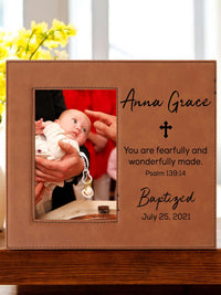 This beautiful leatherette engraved picture frame is perfect to commemorate a child's baptism. The high quality frame is engraved with a beautiful scripture along with their name and date. This is a beautiful way to remember that special day.
