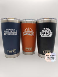 These basketball school mascot tumblers are perfect for school sports teams, booster clubs, athlete moms, coaches, etc. Show your school spirit and pride with these genuine YETI tumblers. The design is engraved on the tumbler and will last forever. There are many designs to choose from in the photos. In addition, customize the tumbler by adding a name to the back.
