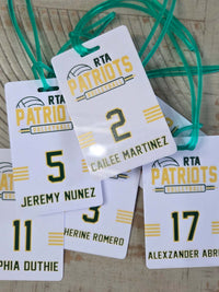 Add a personal touch to your volleyball gear with our custom bag tags, perfect for individual players or entire teams. Crafted with durable, high-quality materials, these tags feature your player’s name, number and team name or mascot for a unique and professional look. Whether you're looking to identify your bag at the gym or simply show team spirit, these personalized tags are designed to withstand the wear and tear of the season. Lightweight and easy to attach, they come with a sturdy strap for secure placement on any bag or equipment. Make your gear stand out with a bag tag that’s as unique as your team.