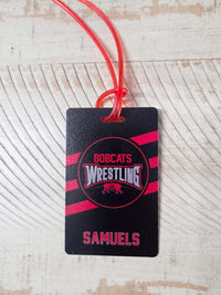 Add a personal touch to your wrestling gear with our custom bag tags, perfect for individual players or entire teams. Crafted with durable, high-quality materials, these tags feature your player’s name, team name or mascot for a unique and professional look. Whether you're looking to identify your bag in the locker room or simply show team spirit, these personalized tags are designed to withstand the wear and tear of the season. Lightweight and easy to attach, they come with a sturdy strap for secure placement on any bag or equipment. Make your gear stand out with a bag tag that’s as unique as your team.